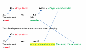 The basic observations are as follows: E1 and E2 are true (the restaurant is good and expensive). But refers to an opposition that is not between the predicates “to be good’ and “to be expensive”: one knows that “everything good is expensive”, and tends to think that all expensive restaurants are necessarily good. The opposition lies in the conclusions drawn from E1 and E2, which both function as arguments. If the restaurant is good, then, let’s eat there. If it’s expensive, let’s go somewhere else. The final decision is based on the latter argument, E2.